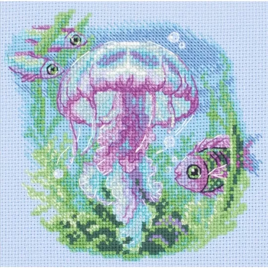 This counted cross stitch design from Aine, features a lilac hued jellyfish floating past some curious fishes.