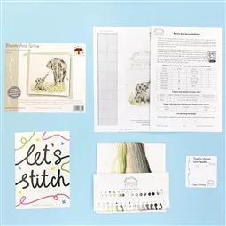 The kit contains Zweigart 14 count speckled aida fabric, pre-sorted stranded cottons, needle, a clear chart and instructions. It uses cross stitch, a few fractionals, back stitch and French knots.