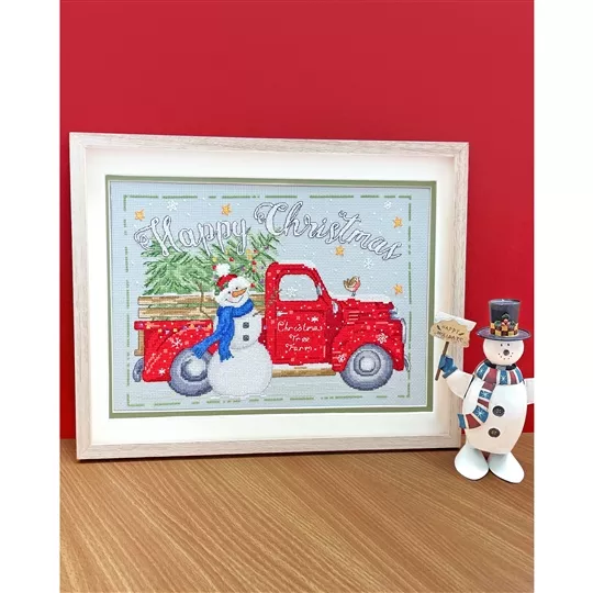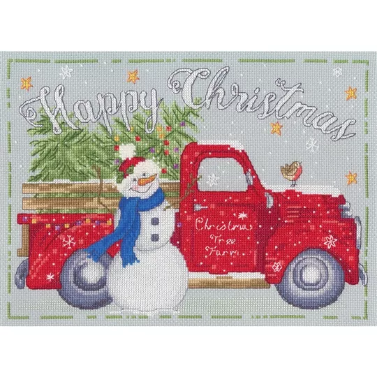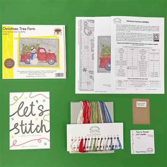 The kit contains Zweigart 14 count misty blue aida fabric, pre-sorted stranded cottons, fluffy lana thread, velcro, a needle, a clear chart and instructions. It uses cross stitch, back stitch and French knots.