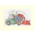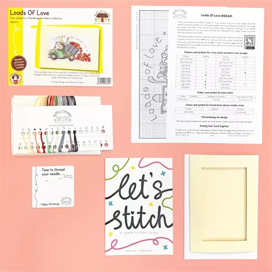 The kit contains Zweigart 14 count antique white aida fabric, pre-sorted stranded cottons,an A5 cream aperture card and envelope, needle, an alphabet (to personalise your design), a clear chart and instructions. It uses cross stitch, back stitch and one French knot.