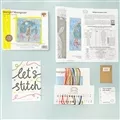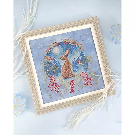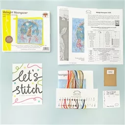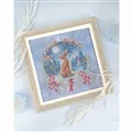 The kit contains Zweigart 14 count full colour printed aida fabric, pre-sorted stranded cottons, metallic threads, a needle, a clear chart and instructions. It uses cross stitch, a few fractionals, back stitch, lazy daisies and French knots.
