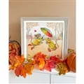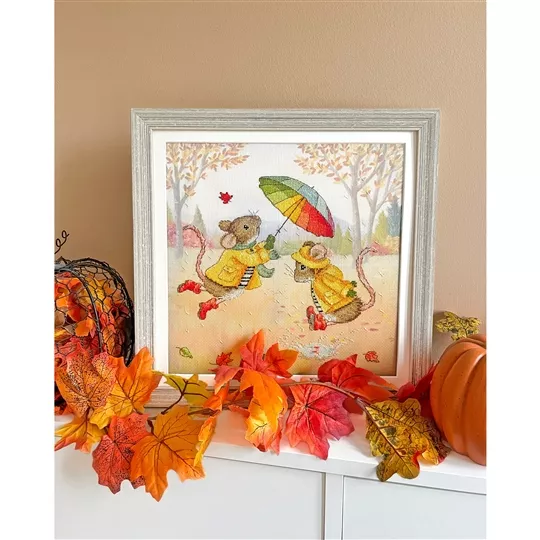 This counted cross stitch design from Sarah Summers for Bothy Threads, features two mice in wet weather coats and boots playing in a puddle with their rainbow umbrella briightening the day.