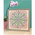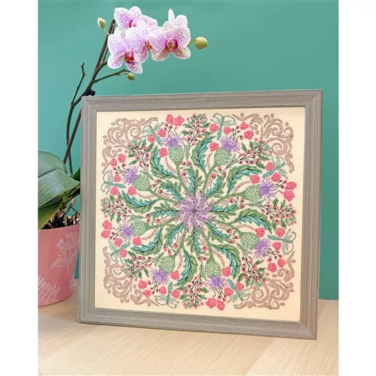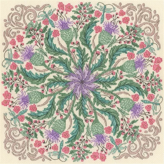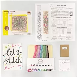 The kit contains Zweigart 14 count cream aida fabric, pre-sorted stranded cottons, white and gold beads, two needles, a clear chart and instructions. It uses cross stitch and back stitch.