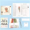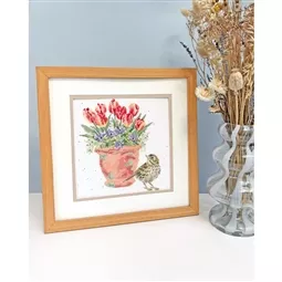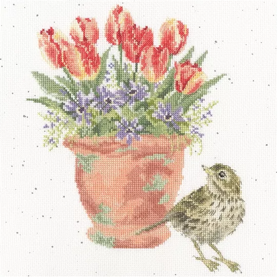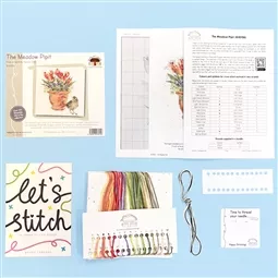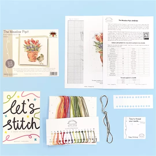 The kit contains Zweigart 14 count speckled aida fabric, pre-sorted stranded cottons, needle, a clear chart and instructions. It uses cross stitch, back stitch and French knots.