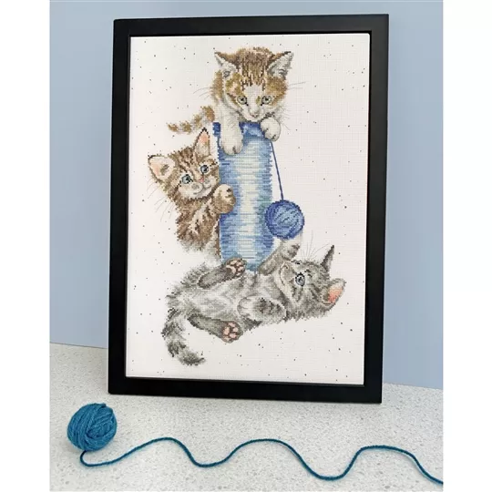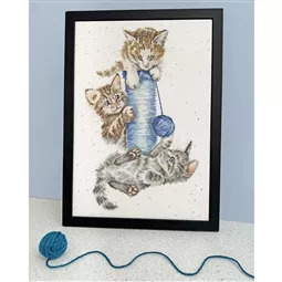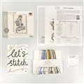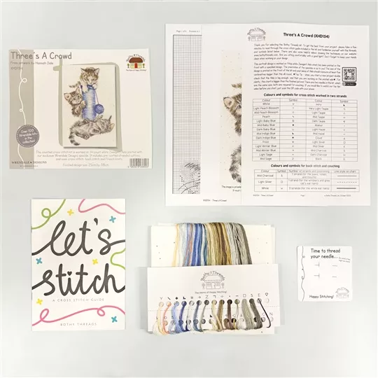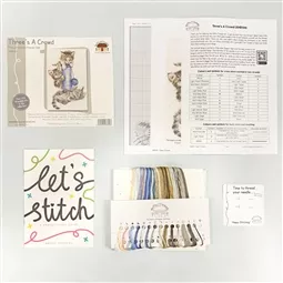 The kit contains Zweigart 14 count speckled aida fabric, pre-sorted stranded cottons, needle, a clear chart and instructions. It uses cross stitch, back stitch and French knots.