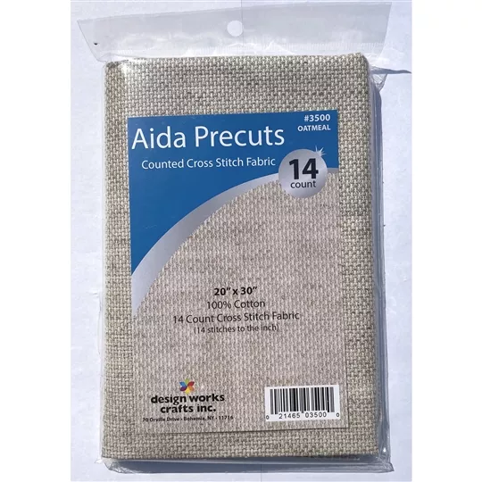 This is a 14 count, giving 14 holes per inch of fabric, and is oatmeal or rustic effect in colour. Measures 76cm by 51cm and is a pre-packed cut piece.