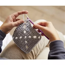The kit contains six 100 gram balls of grey acrylic yarn, 6.5mm crochet hook, sewing needle and clear instructions.