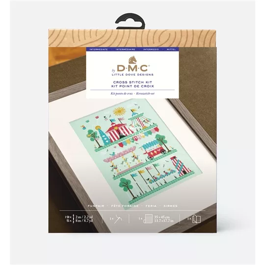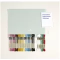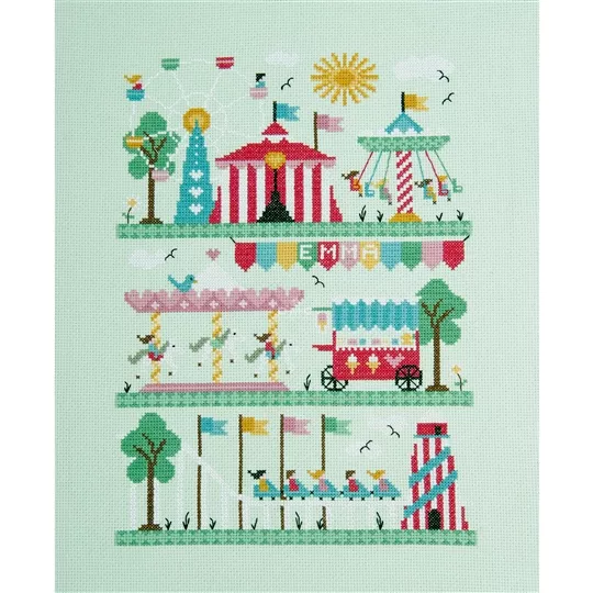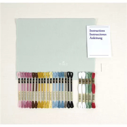 The kit contains 14 count mint green aida fabric, DMC stranded cottons, needle, charted design and instructions.