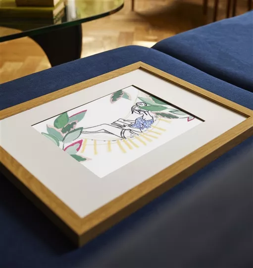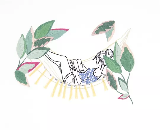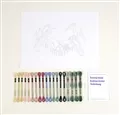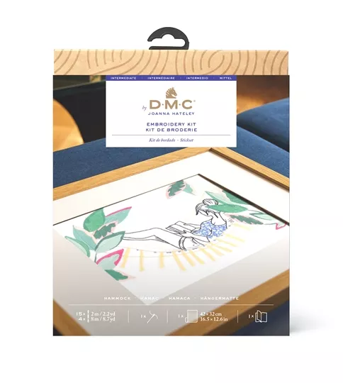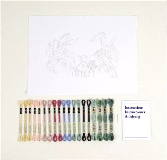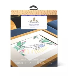 The kit contains white cotton fabric with printed outline, DMC stranded cottons, needle, chart and instructions, including QR code for video stitch tutorial.