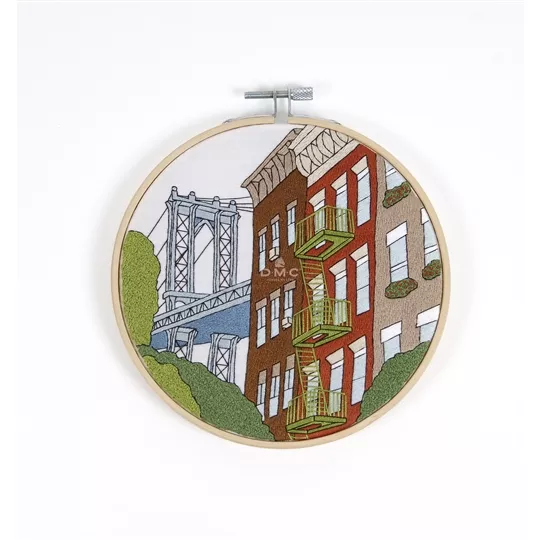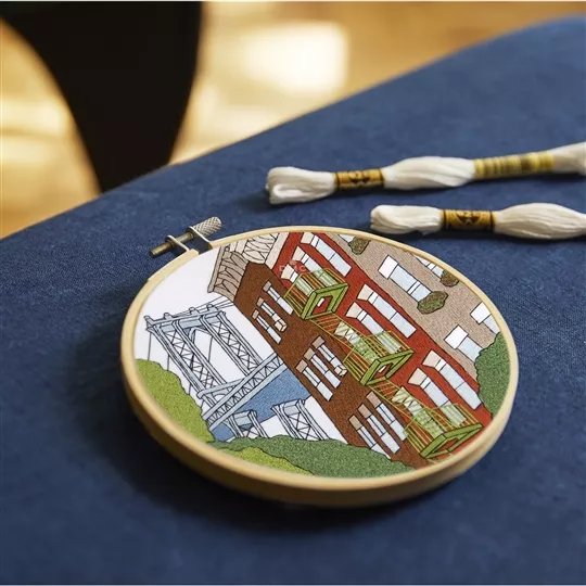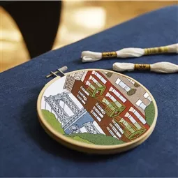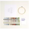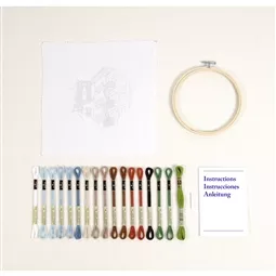 The kit contains white cotton fabric with printed outline, DMC stranded cottons, wooden embroidery hoop, needle, chart and instructions, including QR code for video stitch tutorial.