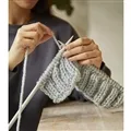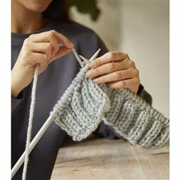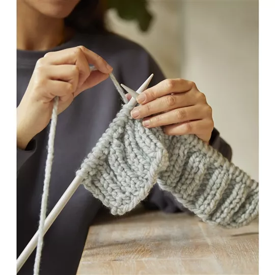 The kit contains two 100 gram balls of grey acrylic yarn, 10mm knitting pins, sewing needle and clear instructions.