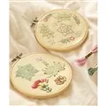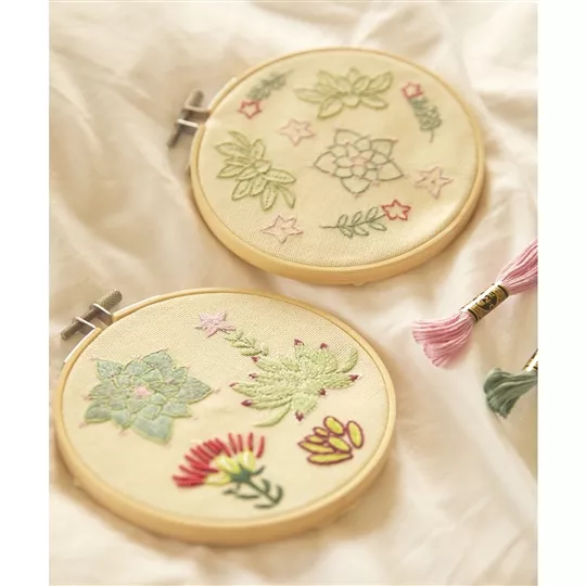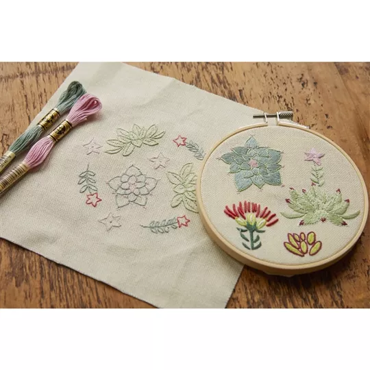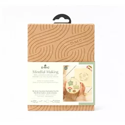 The kit contains two printed cotton fabrics, DMC stranded cottons, one embroidery hoop, needle and stitch instructions.