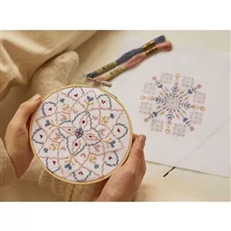 The kit contains 14 count white aida fabirc, DMC stranded cottons, one embroidery hoop, needle, charted designs and instructions.