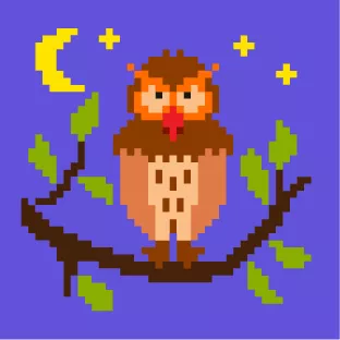 This tapestry design from Gobelin, features a brown owl perched on a branch with a starry sky and crescent moon in the background.