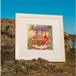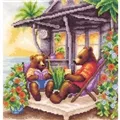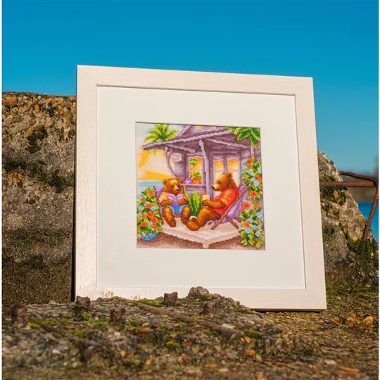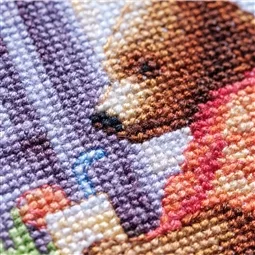 The kit contains 16 count white aida fabric, DMC stranded cottons, beads, ribbon, needle, enlarged chart and clear instructions. Uses cross stitch, long stitch and back stitch.
