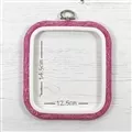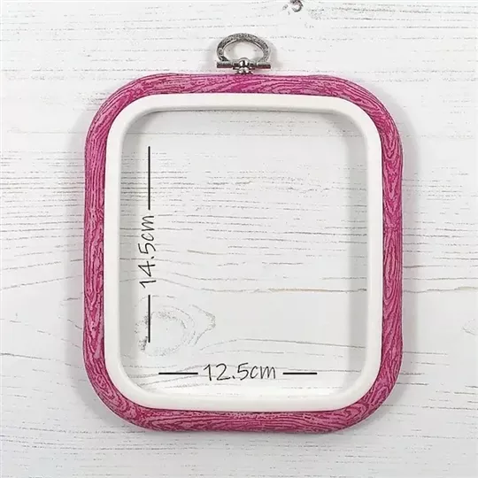 This square hoop measures 12.5cm x 14.5cm around the outer edge (5 x 5.75 inches) and the outer ring is dark pink in colour.