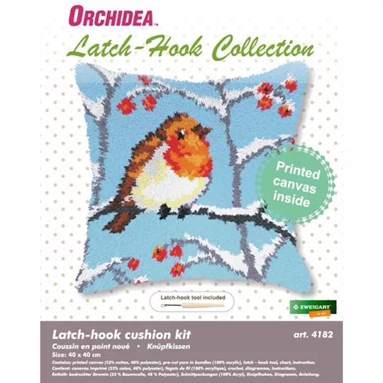 The kit contains 4.5 count colour printed canvas, pre cut acrylic yarns, latch hook tool and instructions.