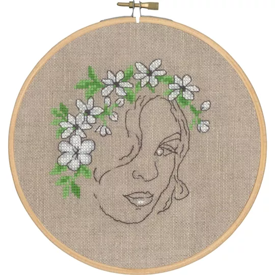 The kit contains 26 count natural linen fabric - stitched over two effectively 13 count, DMC stranded cottons, needle, embroidery hoop, chart and instructions.