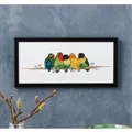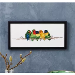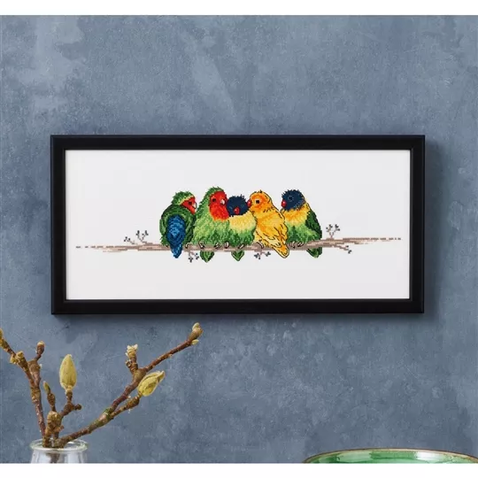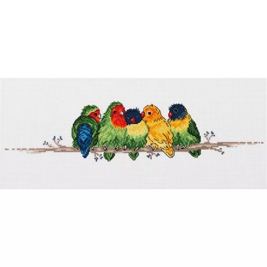 This counted cross stitch design from Permin of Copenhagen, features a row of five lovebirds showing off their bright feathers and fluffed up chests designed to attract their mates.