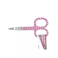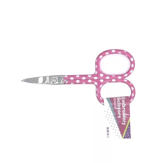 Fun embroidery scissors to brighten your sewing stash. This pair of scissors features a sharp fine blade and bright pink handles with white polka dots.