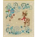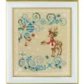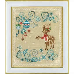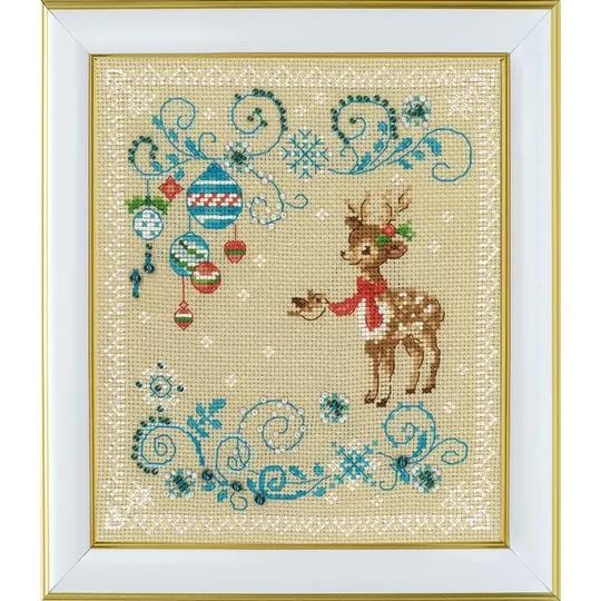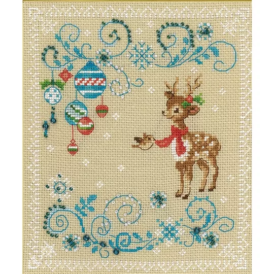 The kit contains 16 count beige aida fabric, DMC stranded cottons on an organiser card, 2.5 grams of seed beads, needles, charted design and instructions.