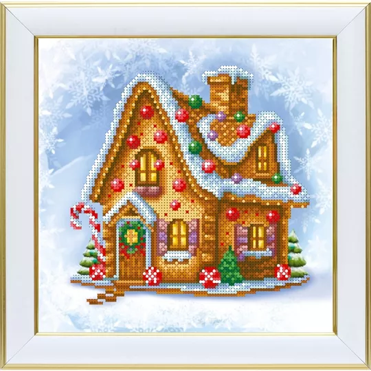 The kit contains satin fabric with printed background and pattern, 77 grams of seed beads, beading needle and thread, paper chart and instructions.