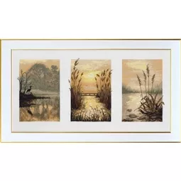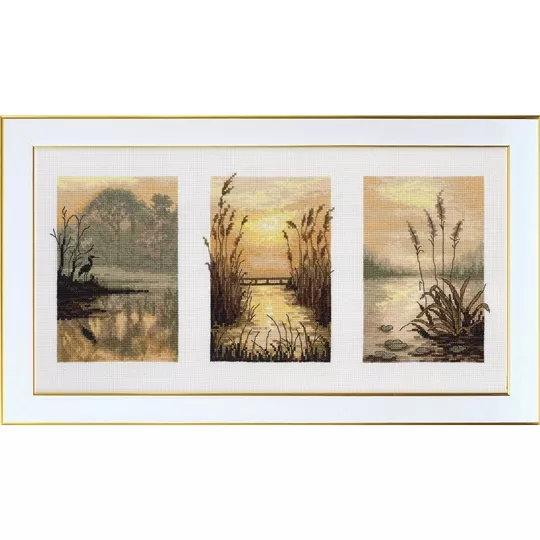 This counted cross stitch triptych design from VDV of Kyiv, features three pictures showing the early morning haze over a river, with a heron in silhouette, a small footbridge and reed growing on the pebbled shore.