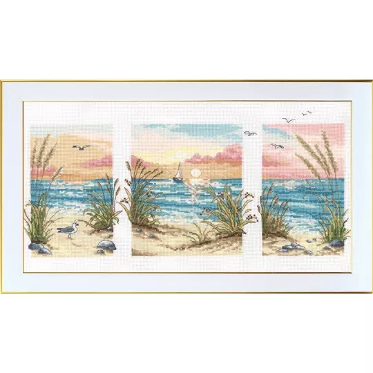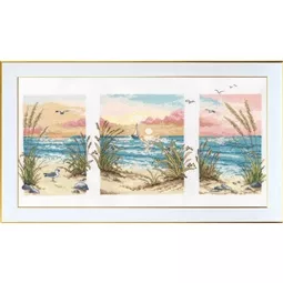 The kit contains 16 count white aida fabric, DMC stranded cottons on an organiser card, needle, charted design and instructions.