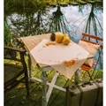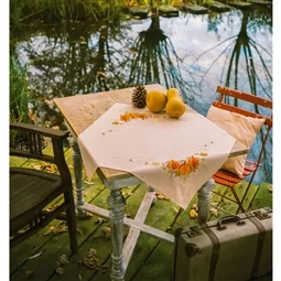 The kit contains salmon pink cotton tablecloth with hemmed inwoven border and printed design, DMC stranded cottons, needle, stitch chart and instructions. Uses satin stitch, long stitch, running stitch, stem stitch and long and short stitch.