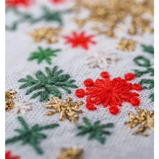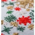 The kit contains pre-finished white cotton tablerunner with printed design, DMC stranded cottons, needle, stitch chart and instructions. Uses long stitch, loop stitch, stem stitch, and French knots.