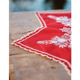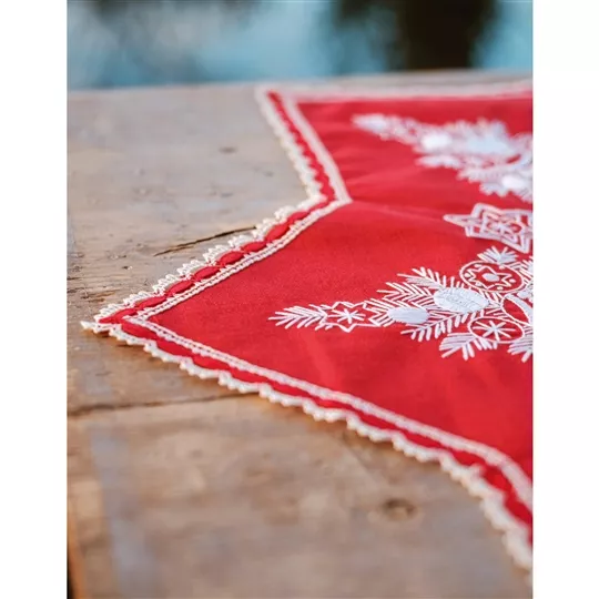 The kit contains pre-finished shaped red cotton tablecloth with hemmed lace border and printed design, DMC stranded cottons, needle, stitch chart and instructions. Uses satin stitch, long stitch, stem stitch and french knots.