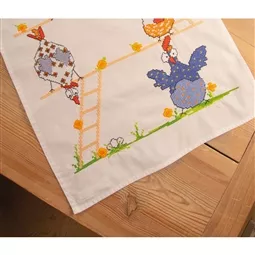The kit contains an ivory 100% cotton table runner with inwoven hem and printed design, DMC stranded cottons, needle, stitch chart and instructions. Uses cross stitch and back stitch.