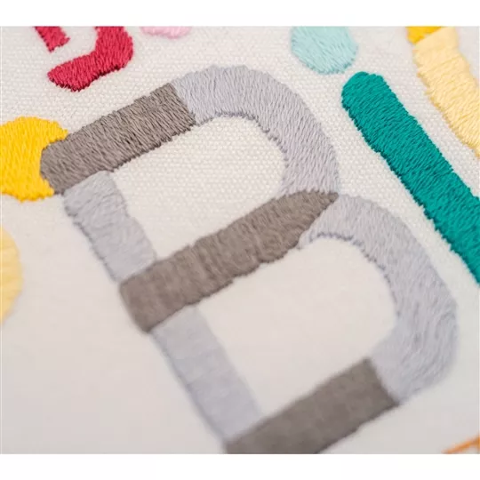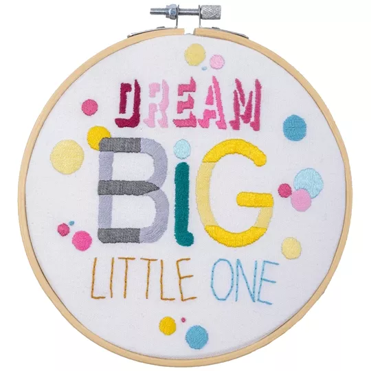 The kit contains white 100% cotton fabric with printed design, DMC stranded cottons, embroidery hoop, needle, stitch chart and instructions. Uses satin stitch and back stitch.