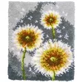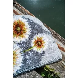 The kit contains 4.5 count hand painted canvas, pre-cut acrylic yarns, latch hook tool, picture of the finshed design and instructions.