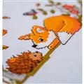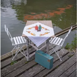 The kit contains a white cotton tablecloth with inwoven hem and printed design, DMC stranded cottons, needle, stitch chart and instructions. Uses cross stitch, back stitch and Fench knots.