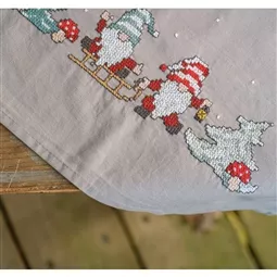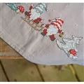 The kit contains a grey 100% cotton tablecloth with inwoven hem and printed design, DMC stranded cottons, needle, stitch chart and instructions. Uses cross stitch and back stitch.