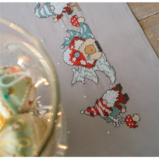 The kit contains a grey 100% cotton table runner with inwoven hem and printed design, DMC stranded cottons, needle, stitch chart and instructions. Uses cross stitch and back stitch.