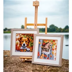 This counted cross stitch design from Vervaco, features a tabby kitten sticking his head through a fence to watch the falling autumn leaves.