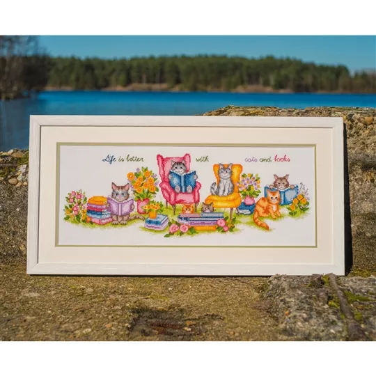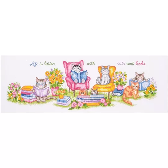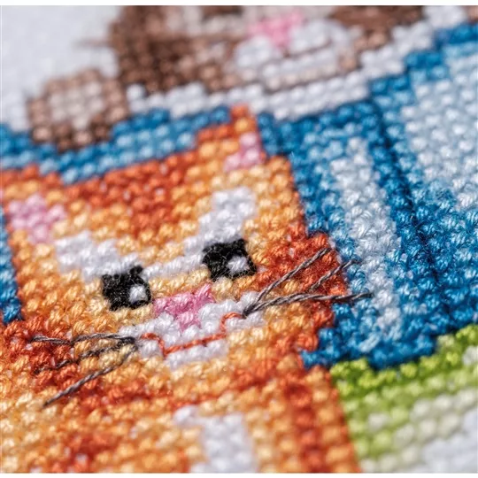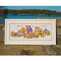 The kit contains 14 count white aida fabric, DMC stranded cottons, needle, enlarged chart and instructions. Uses cross stitch and back stitch.