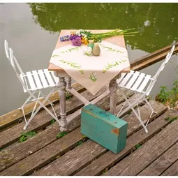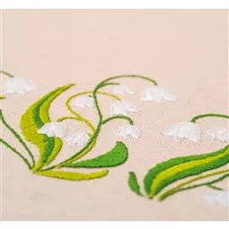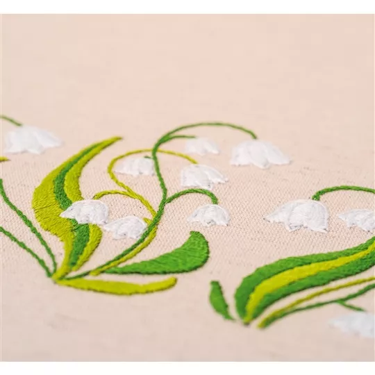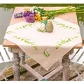 The kit contains natural 50% cotton, 50% linen tablecloth with hemmed inwoven border and printed design, DMC stranded cottons, needle, stitch chart and instructions. Uses satin stitch and stem stitch.
