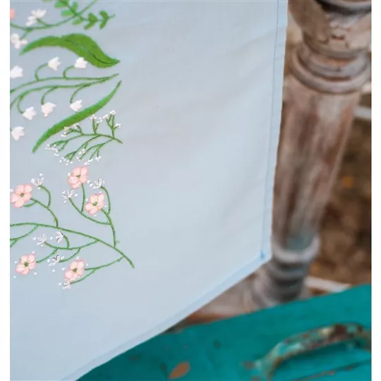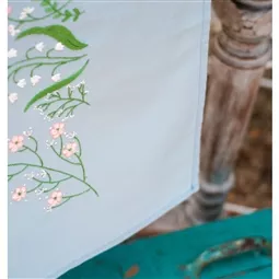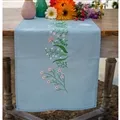 The kit contains light blue 100% cotton table runner with hemmed inwoven border and printed design, DMC stranded cottons, needle, stitch chart and instructions. Uses satin stitch, long stitch, loop stitch, French knot, stem stitch and short stitch.