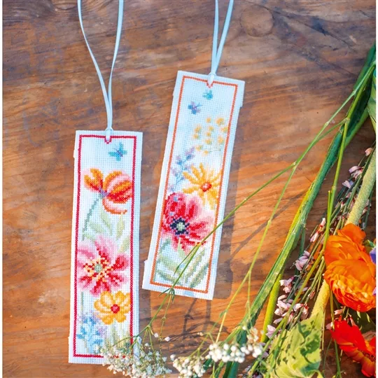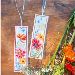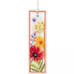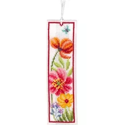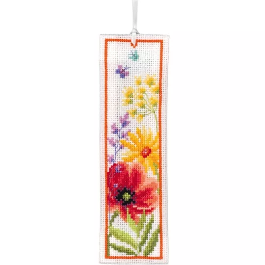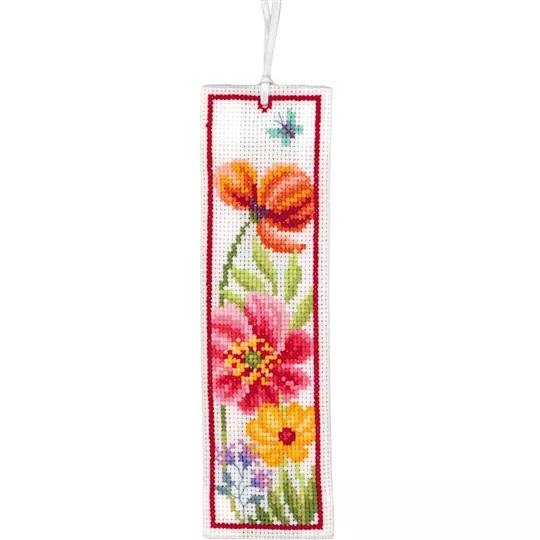 The kit contains 14 count white aida fabric, DMC stranded cottons, ribbon, needle, enlarged chart and instructions. Uses cross stitch and long stitch.