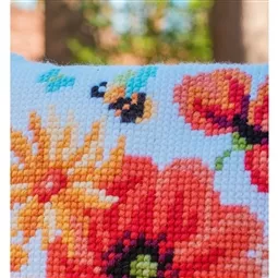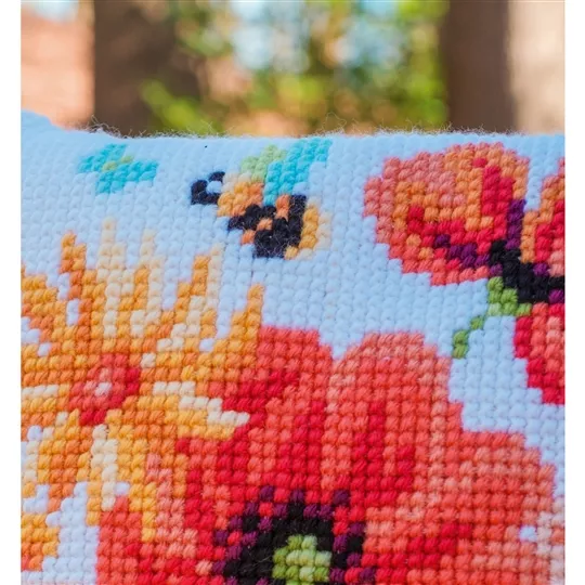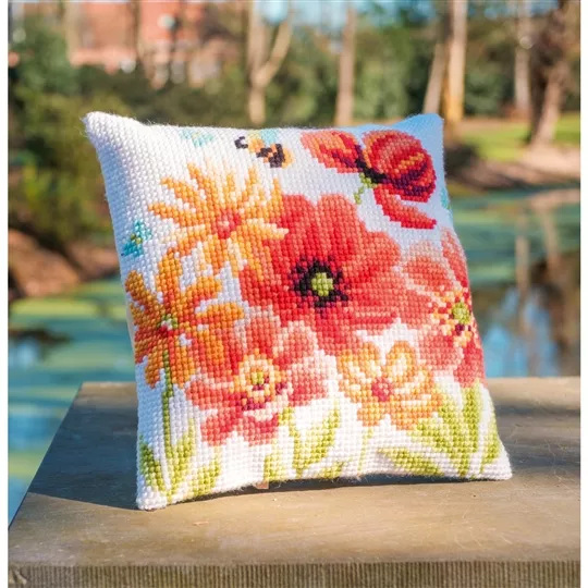 The kit contains 4.5 count hand painted canvas, acrylic yarns, "I Stitch with Vervaco" label, needle, picture of finished design and coloured diagram with instructions. Backings are sold separately, and are available in the cushion accessories range.