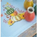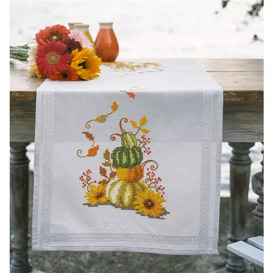 The kit contains a light grey cotton table runner with inwoven hem and printed design, DMC stranded cottons, needle, stitch chart and instructions. Uses cross stitch, back stitch and stem stitch.