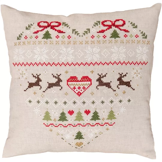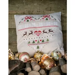 The kit contains natural 50% cotton 50% linen fabric with printed design, DMC stranded cottons, needle, stitch chart and instructions. Uses full cross stitch only.
