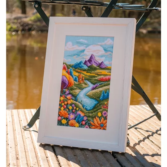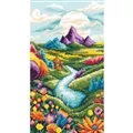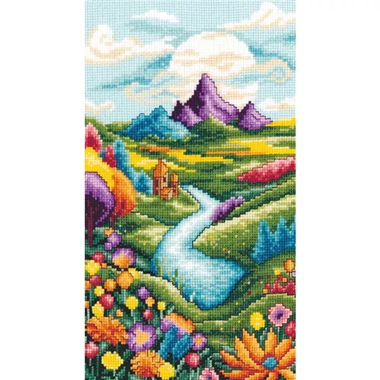 This counted cross stitch design from Vervaco, features a brightly coloured scene with a river running towards distant mountains.