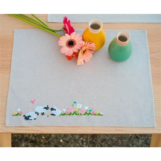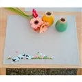 The kit contains two linen look 100% cotton tablemats with hemmed inwoven border and printed design, DMC stranded cottons, needle, stitch chart and instructions. Uses french knot, loop stitch, satin stitch, long stitch and stem stitch.
