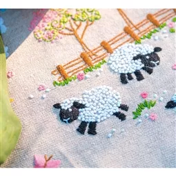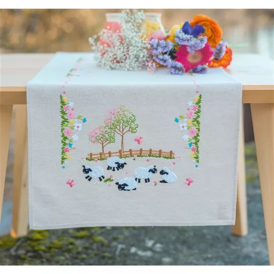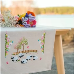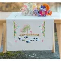 The kit contains linen look 100% cotton tablerunner with hemmed inwoven border and printed design, DMC stranded cottons, needle, stitch chart and instructions. Uses french knot, loop stitch, satin stitch, long stitch, stem stitch and back stitch.