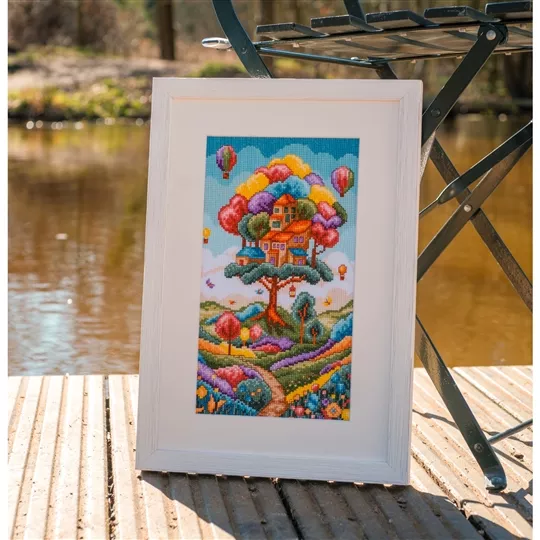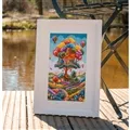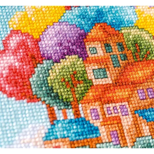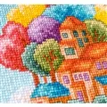 The kit contains 14 count white aida fabric, DMC stranded cottons, needle, enlarged chart and instructions. Uses cross stitch and back stitch.