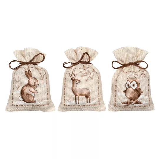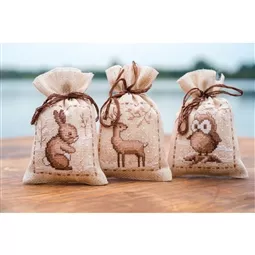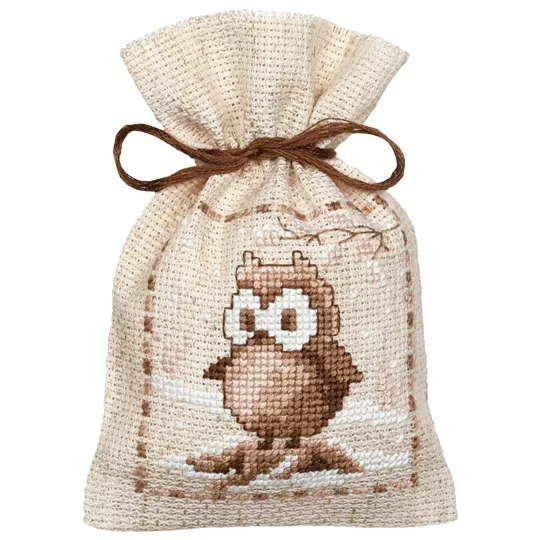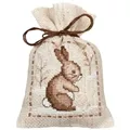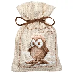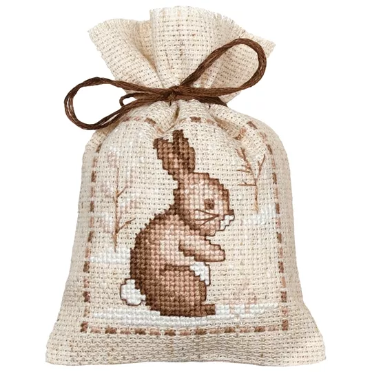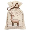 The kit contains 18 count rustic pre-finished aida bags, DMC stranded cottons, ribbon, needle, enlarged chart and instructions. Uses cross stitch and long stitch.